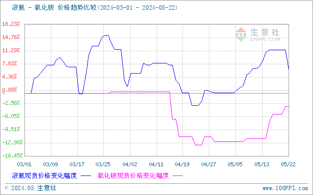 近日(5.13-5.22)液氨市場行情大幅上漲,氯化銨成本支撐走強。據(jù)生意社商品行情分析系統(tǒng)顯示,截至5月22日液氨價格在3320元/噸,較13日3190元/噸上漲了4.08%。